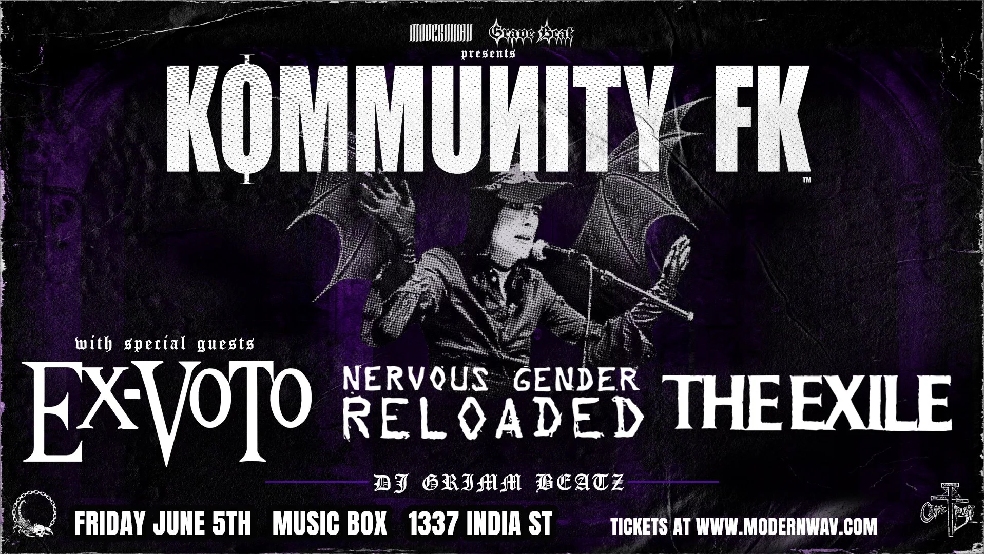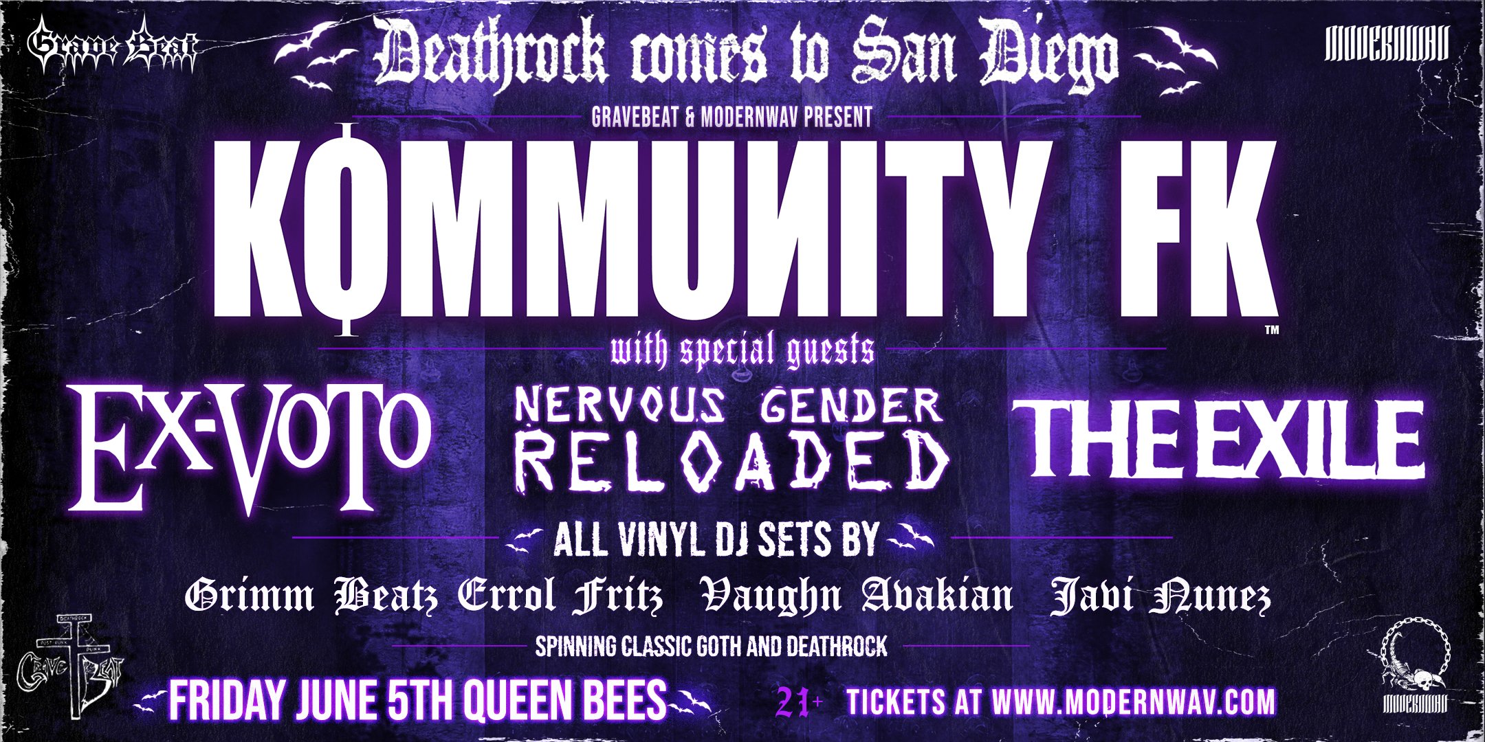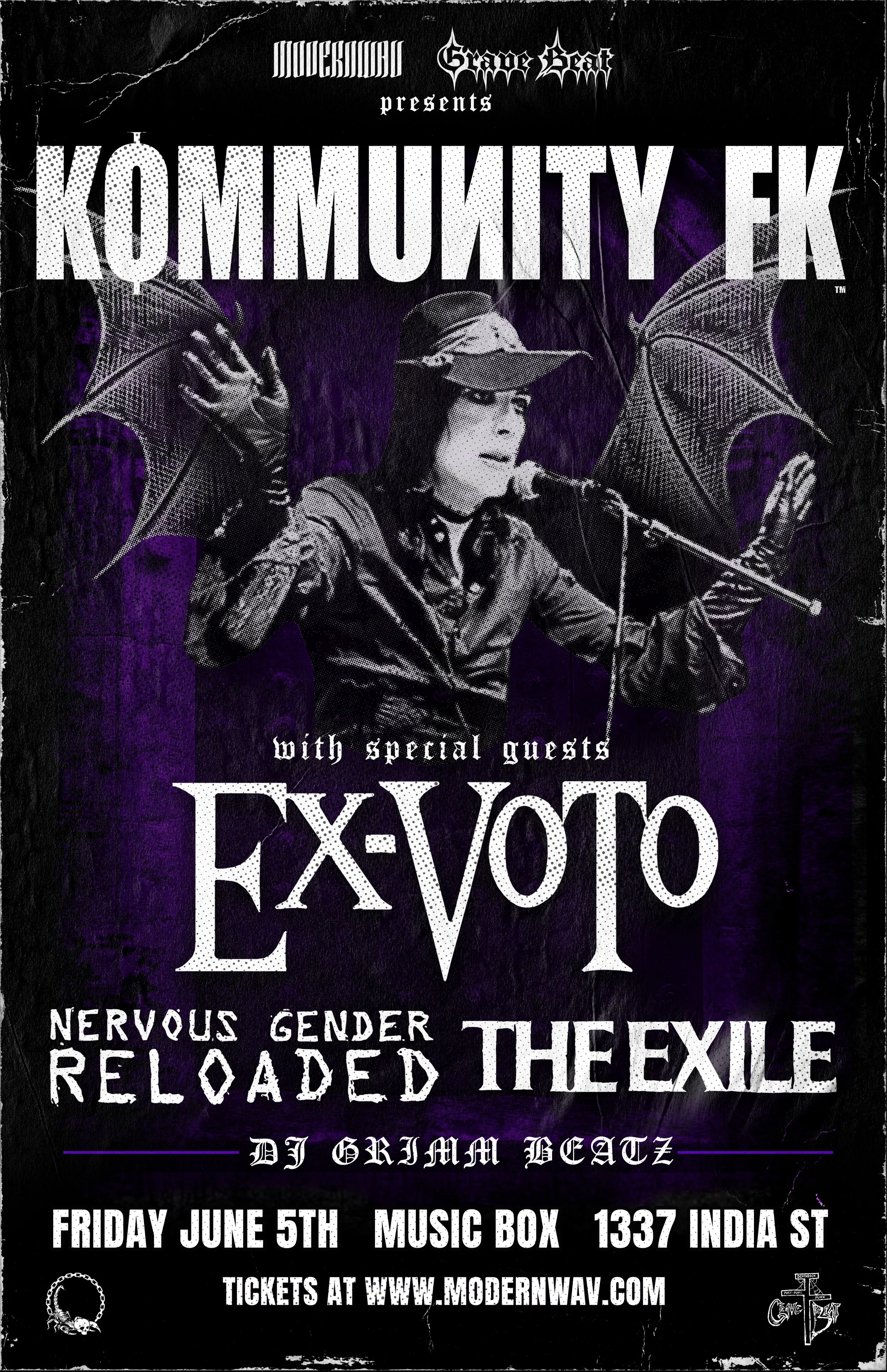 A historic San Diego deathrock night—legacy acts sharing the stage for one rare evening. Performances by Kommunity FK, Ex-Voto, Nervous Gender Reloaded, The Exile, plus a DJ set by DJ Grimm Beatz.